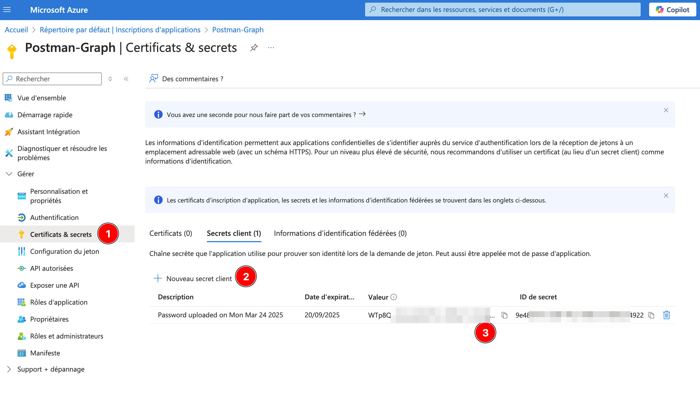 Va dans Certificats et secrets → Crée un secret client → note bien la valeur.