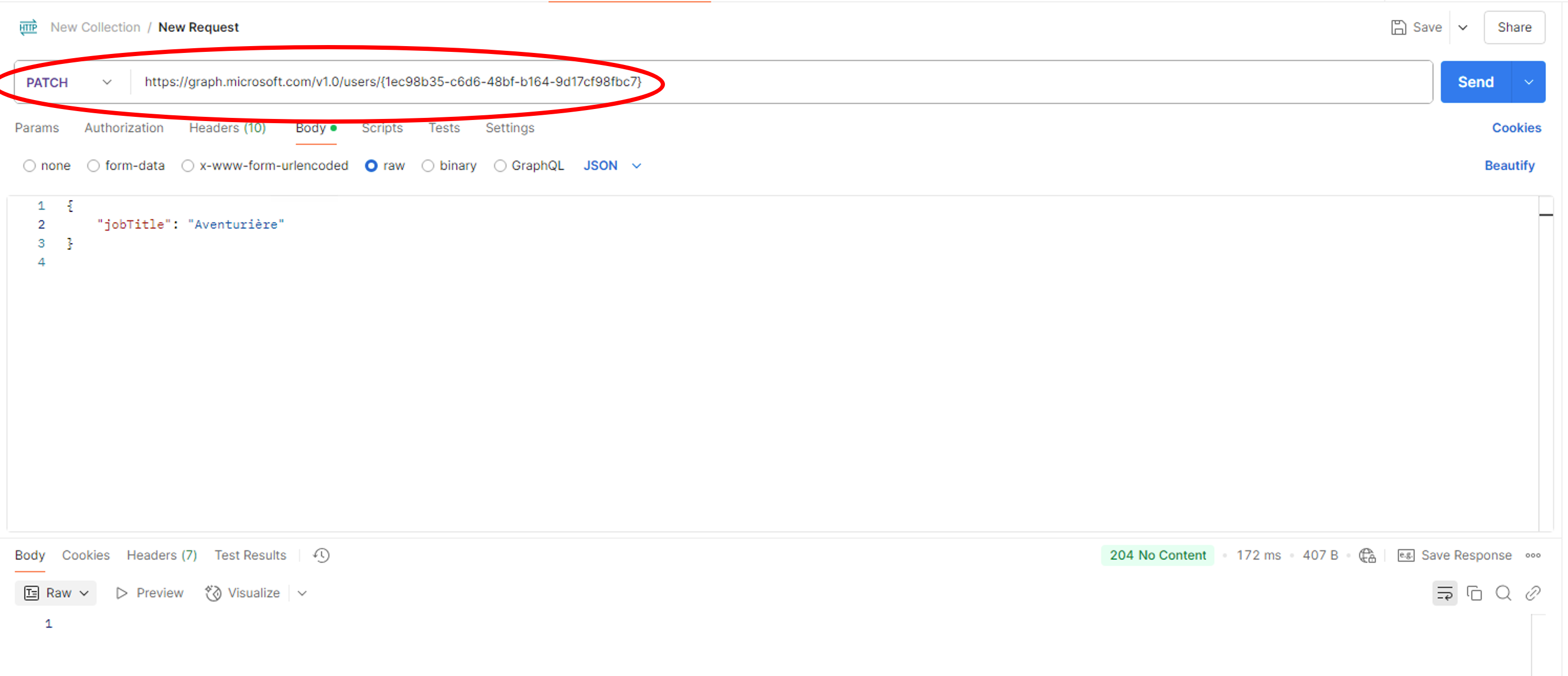 https://graph.microsoft.com/v1.0/users/{1ec98b35-c6d6-48bf-b164-9d17cf98fbc7}Il faut que tu ajoute au "body" les paramètres à modifier sous forme de JSON. Par exemple: